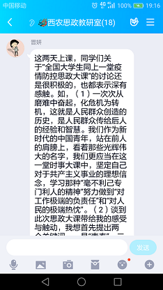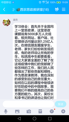 隋牧蓉:学生通过QQ直播共同学习了四位名师名家关于疫情思政的“大课”,课后通过慕课堂组织学生讨论,学生学习热情比较高。这鼓舞了我继续做好本职工作的信心