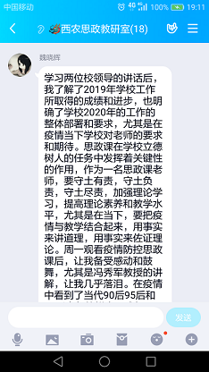 胡燕红:冯秀军老师的公开课,让我深受感动。将抗击新冠肺炎疫情的“中国故事”“西农故事”融入学生思想政治工作质量提升工程,不断提升铸魂育人成效,是十分重要的