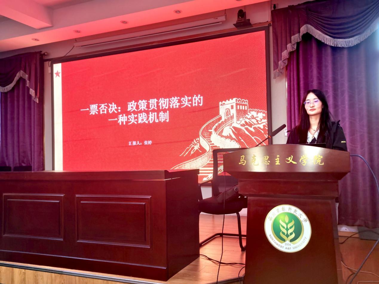 张婷博士为支部党员做了“一票否决:政策贯彻落实的一种实践机制”主题报告,报告分别从一票否决制的内涵、一票否决制的历史沿革和一票否决制运用的主要事项及属性、一票否决制存在的问题四个方面进行了分享。张婷博士认为,一票否决是中国式现代化实践过程中的治理机制,它具有内生性、适应性、正当性和有效性。在未来的研究中,一票否决制如何在改革创新中完善自身,有待进一步观察。