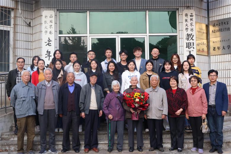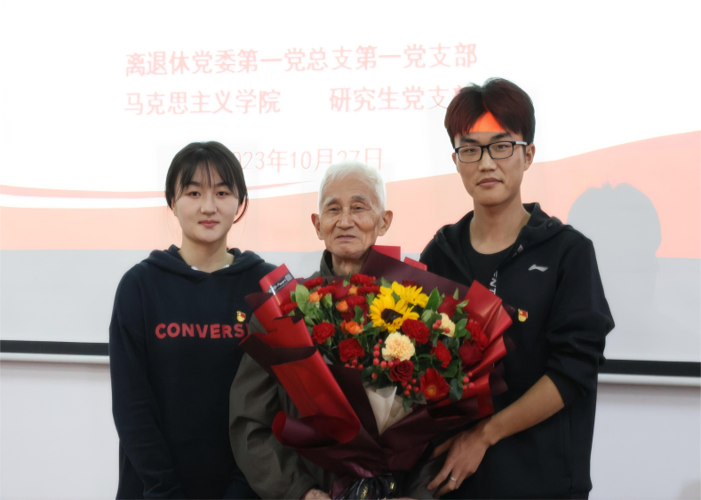 活动中期,为表达青年党员对退休老党员同志的敬意,青年党员代表李杰、祝邦政为离退休党员代表张一平老师献上鲜花并亲切合影。