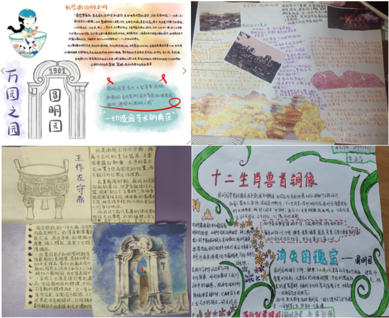 二、以史为鉴,培养家国情怀。组织学生线上观看《圆明园》纪录片,了解中西园林的不同特点,体会皇家园林的独特性;树立传统文化与古建筑文物的保护意识。通过圆明园灾难的起因与过程,了解圆明园的屈辱历史,激发爱国主义精神。通过转教讲解,提升个人的民族感和民族精神。布置作业《国宝守护人》,鼓励学生查阅资料,讲述自己喜欢的圆明园文物的前世今生,培育学生爱国主义情怀,让同学了解历史、感受历史,并铭记历史。