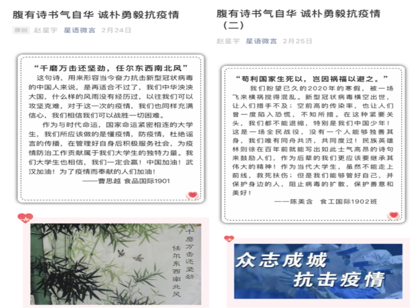 一、引经据典,弘扬传统文化。要求学生借鉴古代诗词中名句,结合抗击新冠状病毒特殊时期,来结合诗词,表达同学对于抗击疫情的责任和信心,山川异域,风月同天黄沙百战穿金甲,不破楼兰终不还江南无所有,聊赠一枝春苟利国家生死以,岂因祸福避趋之岂曰无衣,与子同裳青山一道同云雨,明月何曾是两乡投我以木桃,报之以琼瑶等中国古典诗词里的名句,被学生所引用,传承中国传统文化的同时,书写西农学子的使命与担当。