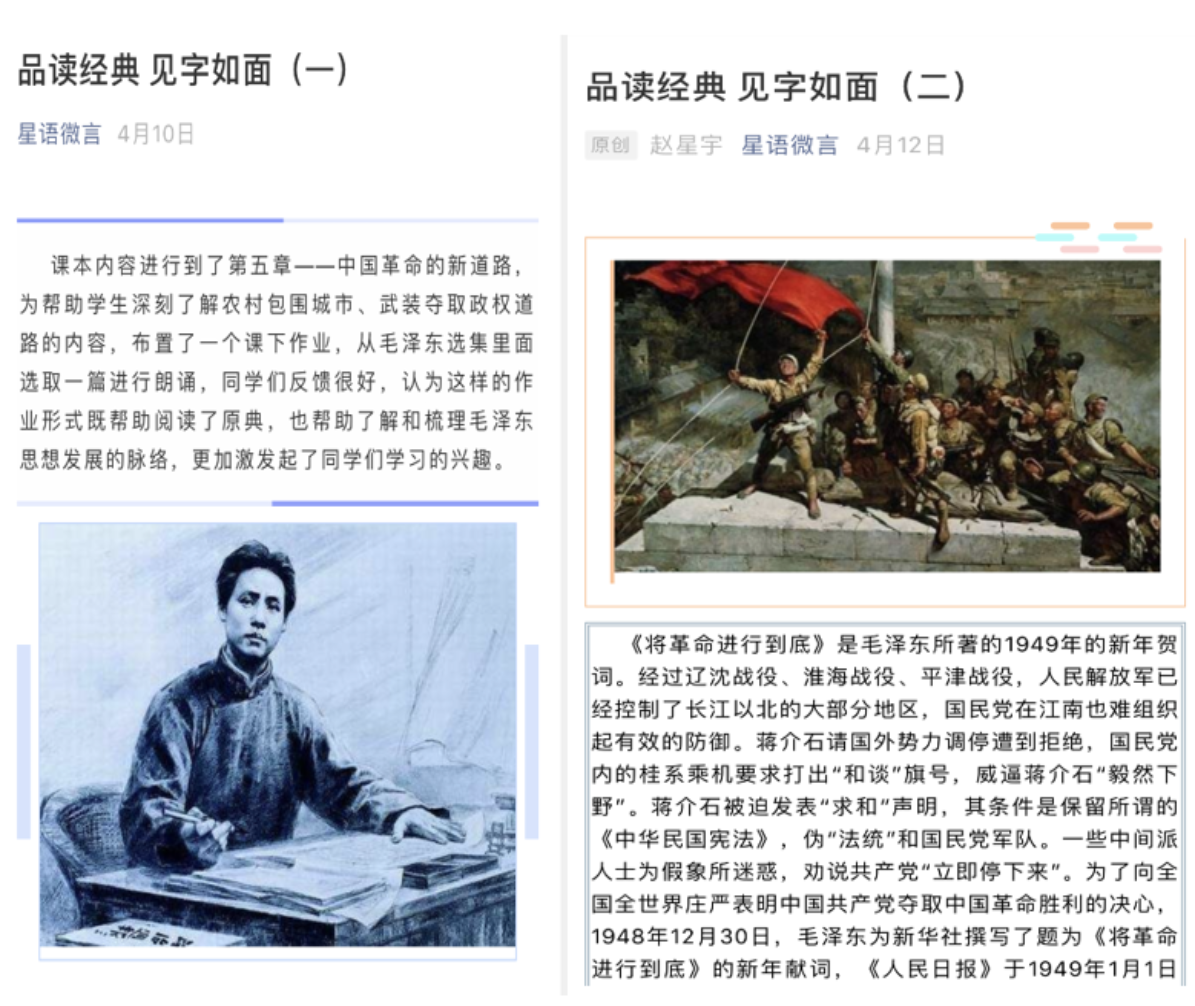 三、品读经典,展现青春风采。鼓励同学在家利用课余时间阅读红色经典,不局限于近现代史纲要课本内容学习,例如阅读《毛泽东选集》,拓展了阅读视野,扩大了知识储备,完善了认知体系,深刻理解了推动历史事件背后的重要文章。让学生学会用发展的眼光看待历史问题,用理论武装头脑,做到问渠那得清如许,为有源头活水来的求学状态,用视频或者音频的形式记录下来,展现新时代大学生朝气蓬勃、奋发进取的精神风貌。
