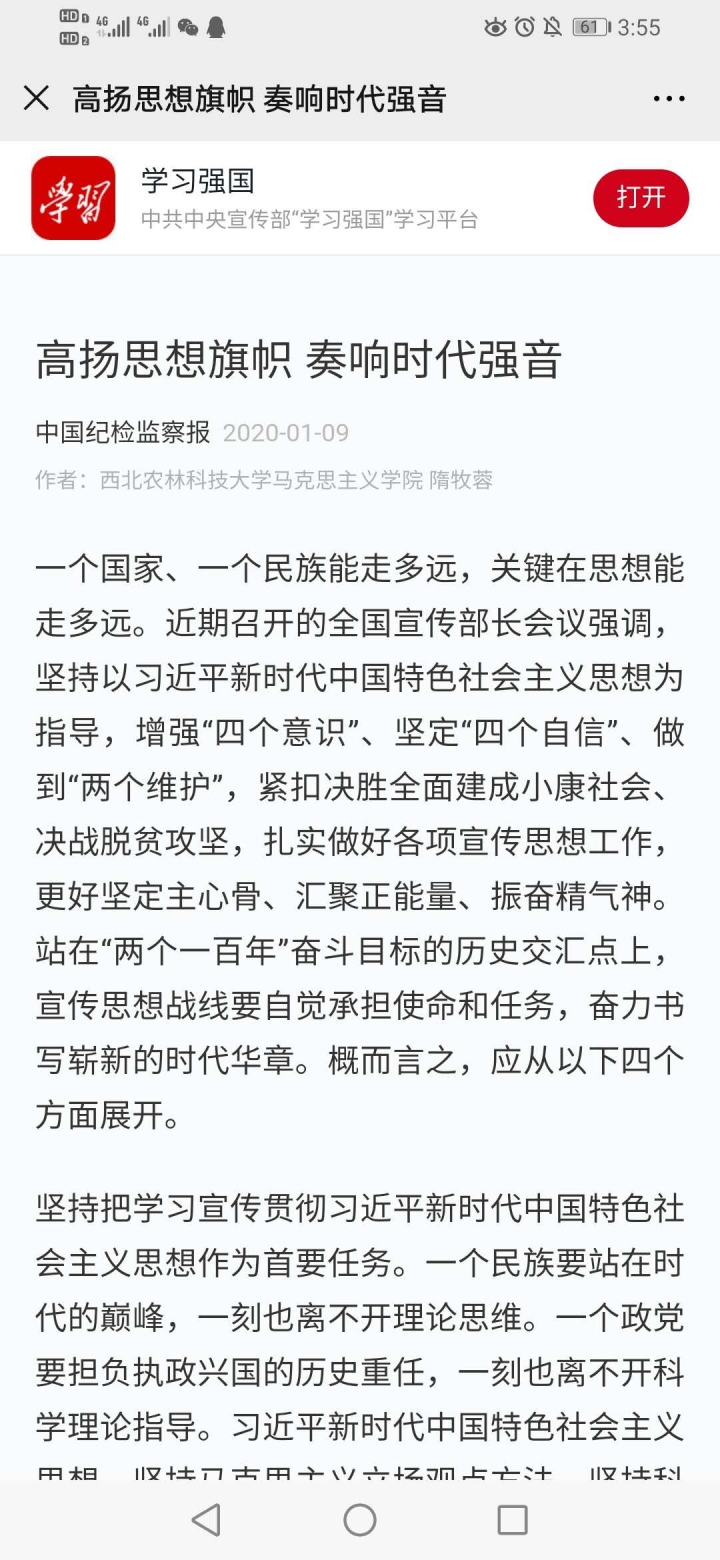 我院教师隋牧蓉的一篇《高扬思想旗帜 奏响时代强音》理论文章于2020年1月9日首发在《中国纪检监察报》理论版,而后被求是网、社会科学网、人民网等多家影响力较大的网络平台转载,特别是被学习强国全文转载,获得了高点击量。学习强国平台由中宣部主管,面向全社会的优质平台,是党员干部和群众在线学习的重要阵地之一,是新形势下强化理论武装和思想教育的创新平台,也是推动习近平新时代中国特色社会主义思想学习宣传贯彻不断深入的重要渠道。该文章在学习强国平台上线,体现了西农马院教师积极发声,同时提高了我院的影响力。