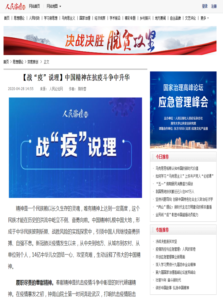 “精神是一个民族赖以长久生存的灵魂,唯有精神上达到一定高度,这个民族才能在历史的洪流中屹立不倒、奋勇向前。中国精神扎根中国大地,形成于中华民族披荆斩棘、战胜风险的实践探索中,引领中国人民继续奋勇拼搏、自强不息。新冠肺炎疫情发生以来……14亿中华儿女团结一心、攻坚克难,生动诠释了伟大的中国精神。我院教师隋牧蓉的一篇理论文章《中国精神在抗疫斗争中升华》于2020年4月28日首发人民论坛网理论栏目说理,并或全网多家优质媒体转载,更可喜的是此文被人民日报海外版全文转载。实现了我院教师研究和发声载体媒介范围的扩大,扩大了影响力和提高了学科活跃度。