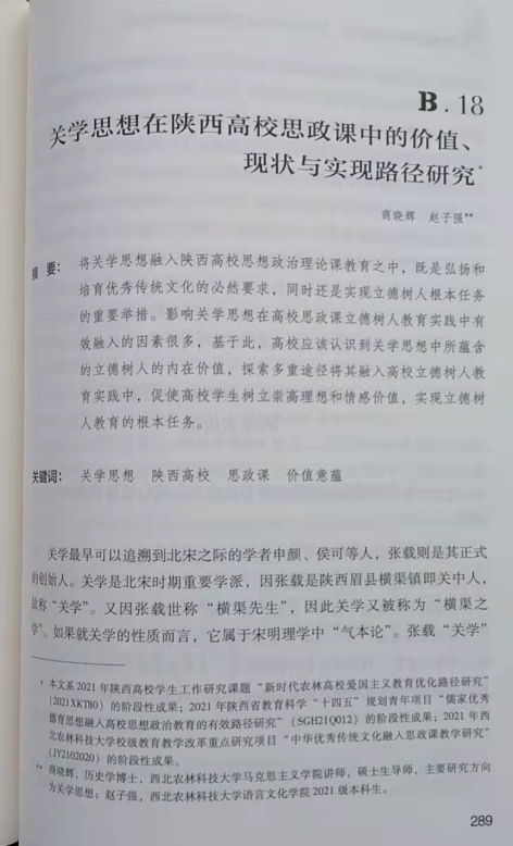近日,由社会科学文献出版社出版的《陕西蓝皮书:陕西文化发展报告(2022年)》正式面向社会发行。我院商晓辉博士主笔的研究报告《关学思想在陕西高校思政课中的价值现状与实现路径研究》成功入选。该研究报告受到陕西省高校学生工作研究项目和陕西省教育科学“十四五”规划项目以及西北农林科技大学校级教学改革研究重点项目的资助。