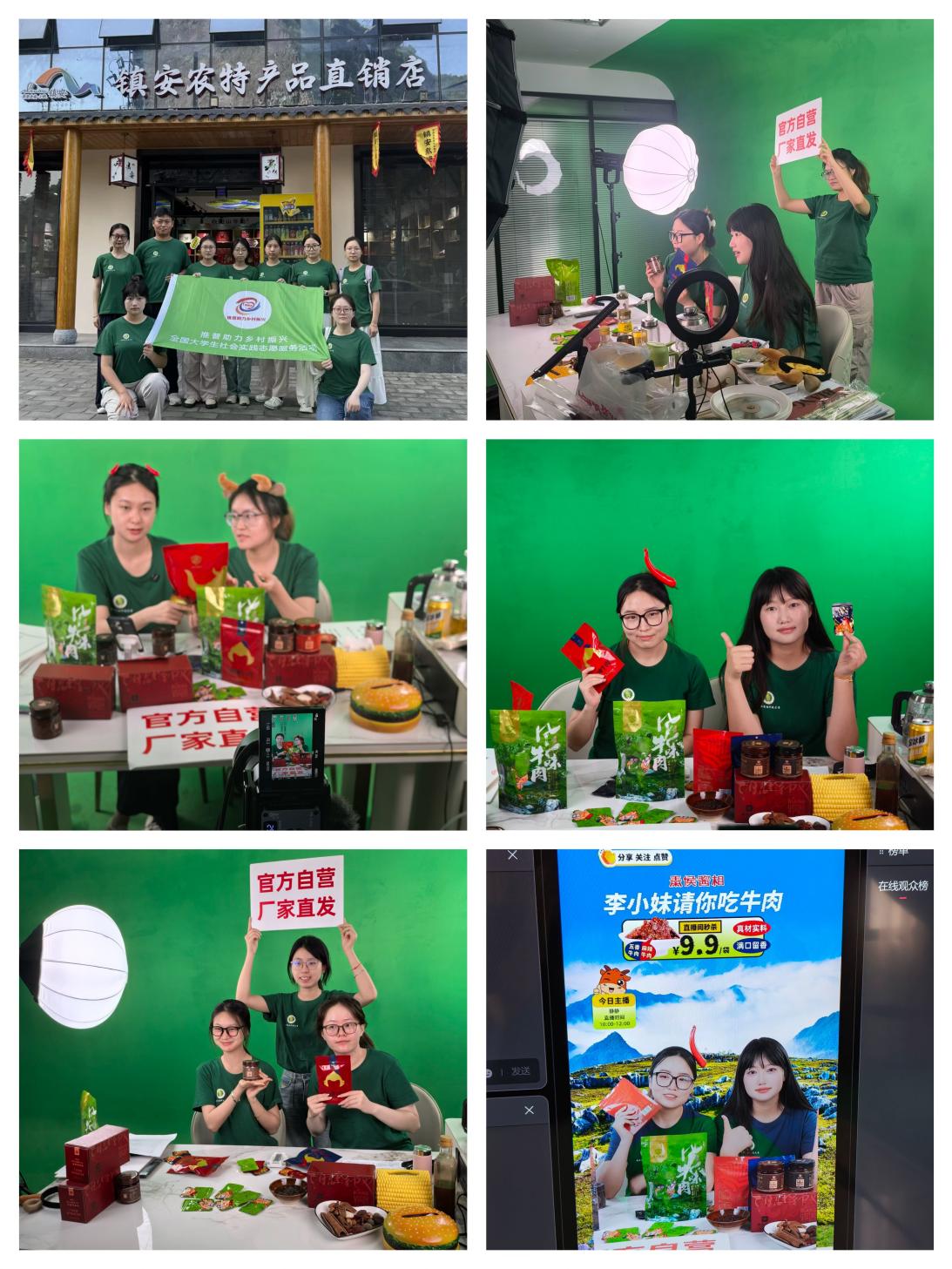团队在镇安县助农电商协会的指导下提出创新方案:在普通话教学基础上开设“助农电商实训课”,帮助农户掌握产品描述、品牌故事讲述等实用语言技能,用通俗易懂的“语言扶贫三件套”——短视频拍摄技巧、直播话术模板、方言与普通话转译手册,手把手教农户用标准“商洛味普通话”展现当地牛肉产品的优势。镜头前,团队成员带上俏皮的黄牛发箍,捧起鲜美的牛肉酱和卤牛肉高声推荐:“咱家镇安特色牛肉,糯香又营养……”;直播间外,当地直播间负责人为队员们竖起大拇指道:“你们这'金嗓子'真给咱牛肉带来新生机了!”除此之外,团队成员在直播间内不断创新直播形式与内容,精心策划了“乡村振兴茶话会”。他们重点介绍了西北农林科技大学近年来在乡村振兴领域取得的显著成果,充分展示了这所农业高校的雄厚科技实力,并将“诚朴勇毅”的校训精神发扬光大。