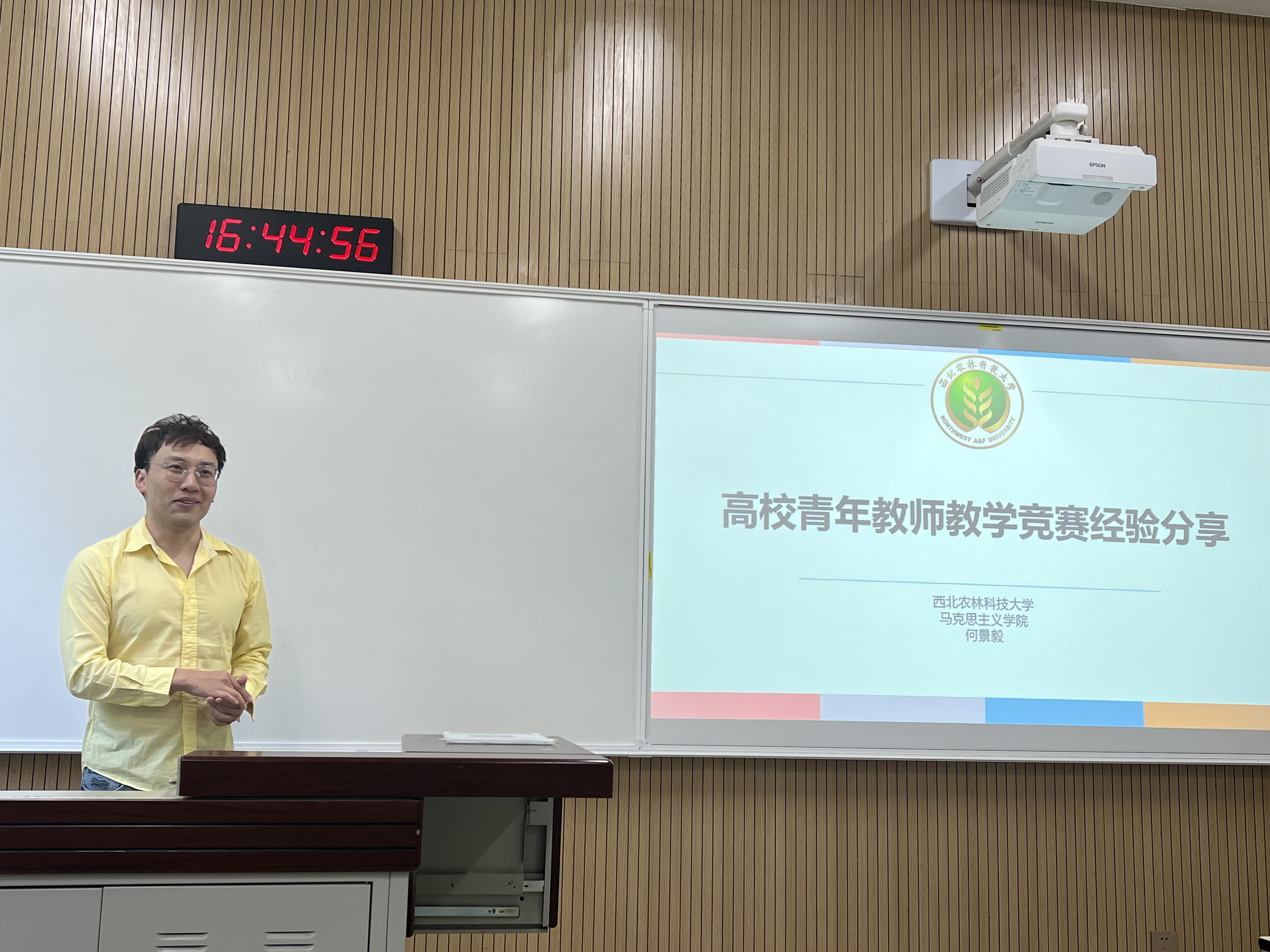 5月24日下午,在西北农林科技大学南校区S1108教室,“第六届全国高校青年教师教学竞赛二等奖”获得者、“第五届陕西高校青年教师教学竞赛特等奖”获得者何景毅博士为马克思主义基本原理系全体教师进行了“高校青年教师教学竞赛经验”的分享,并与各位老师进行了深入交谈。