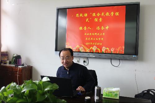 在学术报告中,冯务中主要对“导客为主”的“混合式教学模式”进行了全面深入的介绍。该模式旨在实现学生由以往教育内容的被动接受者与聆听者逐步转变为教育教学活动的主要参与者,而教师在这一过程中则需要扮演好“引导者”的角色,也就是要引导学生“动耳听讲”、“动口言说”、“动目阅读”、“动手写作”以及“动足行动”,由以往的教育客体逐步转变为教育活动的主体。主题报告结束之后,老师们与冯老师进行了深入交流,感到获益非浅。大家表示,冯老师以扎实的理论功底开展混合课程教学,把教课变成研课,教学方法极具启发性。最后,邓谨院长总结认为,陈宝生同志曾指出:做好思想政治理论课建设工作一定要努力开展思路攻坚、师资攻坚、教材攻坚、教法攻坚以及机制攻坚,冯老师的“混合式教学模式”正是对于五个攻坚的生动诠释。邓谨高度评价冯老师的报告,并激励学院全体教师继续探索更为生动有效的教学方法,增强学生对思政课的获得感。