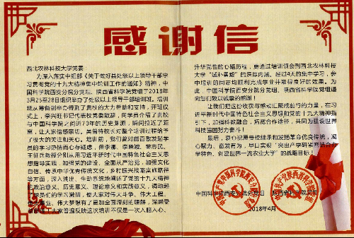 中科院西安分院分党组、陕西省科学院党组为县处级以上领导干部学习贯彻党的十九大精神举办了培训班。开云电子官方网站-登录入口李娜教授、李晓娥教授为学员分别从用习近平新时代中国特色社会主义思想指导实践,加强党的建设、全面从严治党,加强文化自信方面,深入浅出、生动系统地阐述了党的十九大精神的政治意义、历史意义、理论意义和实践意义。学员对本次培训评价很高,是一次入脑入心、升华党性的心路历程。中科院西安分院分党组、陕西省科学院党组专门写了一封感谢信,对授课教授致以诚挚的感谢。