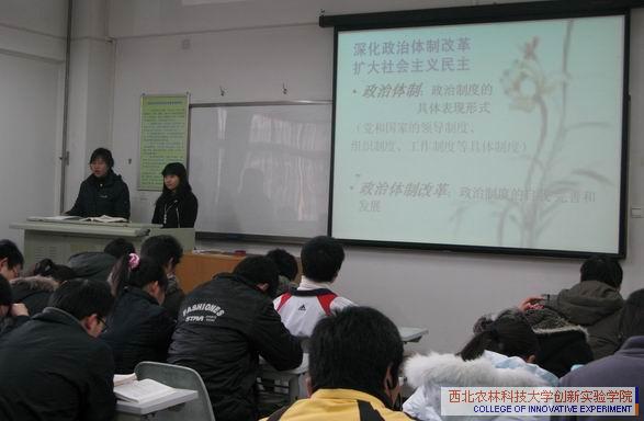 在观摩课堂上,植科082班的崔立操同学,生技081班的宋战同学,生工081班刘冬颖同学,生工082班的李文静同学自主设计,分节讲述了中国特色社会主义政治部分课程内容。他们的讲课可谓是精心准备,资料丰富,精彩辈出。特别是刘冬颖同学和李文静同学通过对话的方式向大家讲述人权问题时,不时引起大家的阵阵掌声。