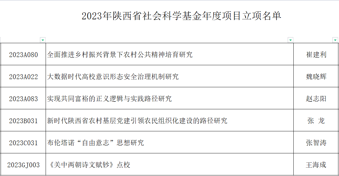 9月21日,陕西省哲学社会科学工作办公室公布了2023年陕西省社会科学基金年度项目立项名单,学院教师王海成申报的“《关中两朝诗文赋钞》点校”、魏晓辉申报的“大数据时代高校意识形态安全治理机制研究”、张龙申报的“新时代陕西省农村基层党建引领农民组织化建设的路径研究”、赵志阳申报的“实现共同富裕的正义逻辑与实践路径研究”、崔建利申报的“全面推进乡村振兴背景下农村公共精神培育研究”、张智涛申报的“布伦塔诺“自由意志”思想研究”共6个项目获批立项。