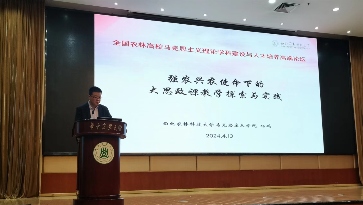 2024年4月13日至14日,全国高等农林院校思想政治理论课高端论坛在华中农业大学举行,本次论坛由全国高等农林院校思想政治理论课教学研究会主办,华中农业大学开云电子官方网站-登录入口承办。来自全国近30所院校的200余位与会代表,聚焦“马克思主义理论学科建设与人才培养”开展理论研讨和深入交流。我院杨鹏副院长参加会议并做大会主题发言。
