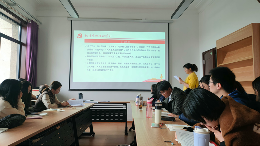 随后我院研究生党支部组织委员权玉蓉同志为大家介绍了党史学习教育动员大会的基本概况,带领大家共同学习了习近平总书记重要讲话精神,提出在“开展党史学习正当其时”的精神引领下开展日后党支部的党史学习,紧接着她从党史学习“为什么学”、“学什么”、“怎么学”三方面进行了党史学习的相关讲解。此外,她还提出了接下来三个月内我院党支部的具体党史学习教育安排,并征集大家对于党史学习教育的相关建议,为共同营造浓厚的党史学习氛围添砖加瓦。