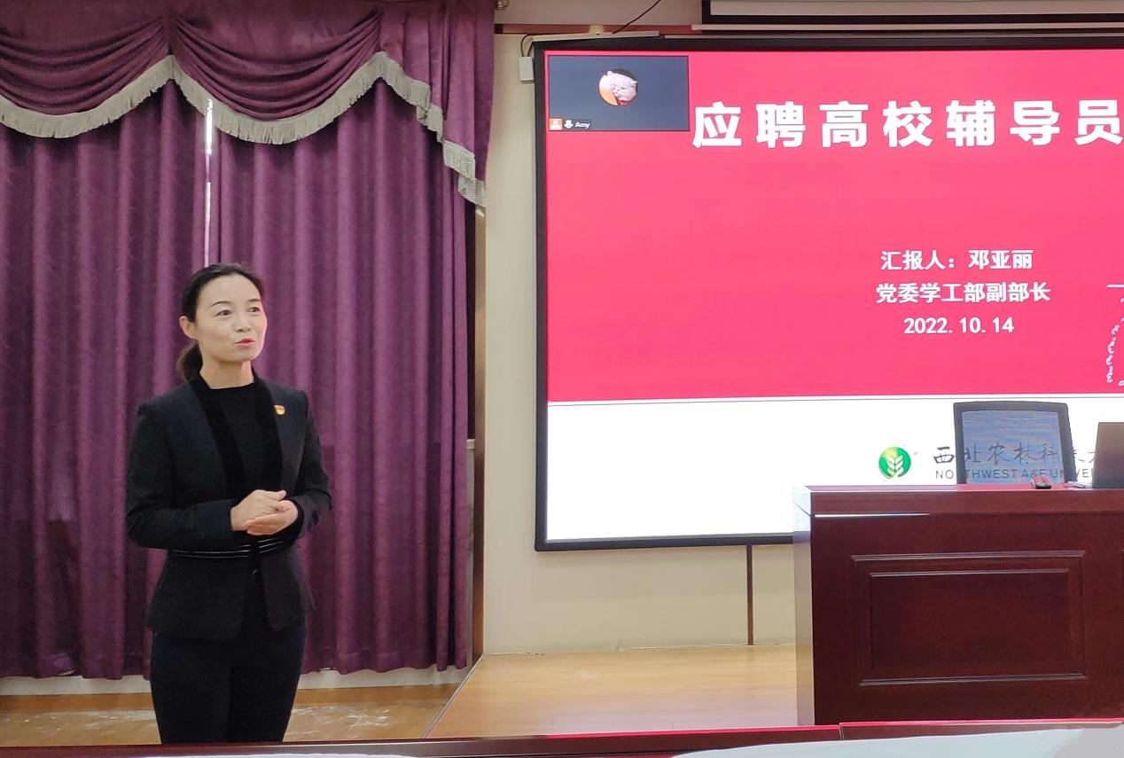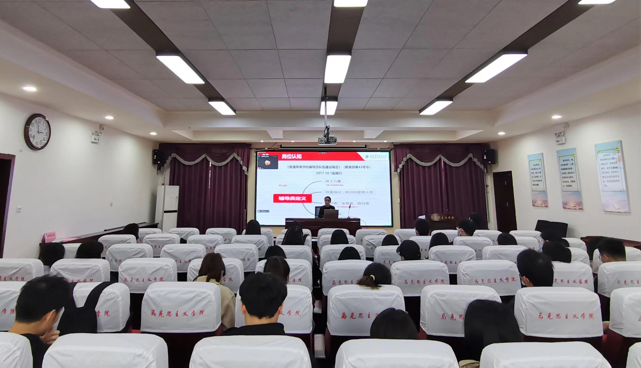 为进一步提升学院学生就业能力,增强就业核心竞争力,促进学生形成并完善自身的职业规划,我院于10月14日下午在学院四楼报告厅开展应聘辅导员知识能力提升培训讲座,邀请学生工作处副处长邓亚丽老师主讲,学院全体研究生线上线下聆听讲座,院党委副书记、副院长王家武主持会议。