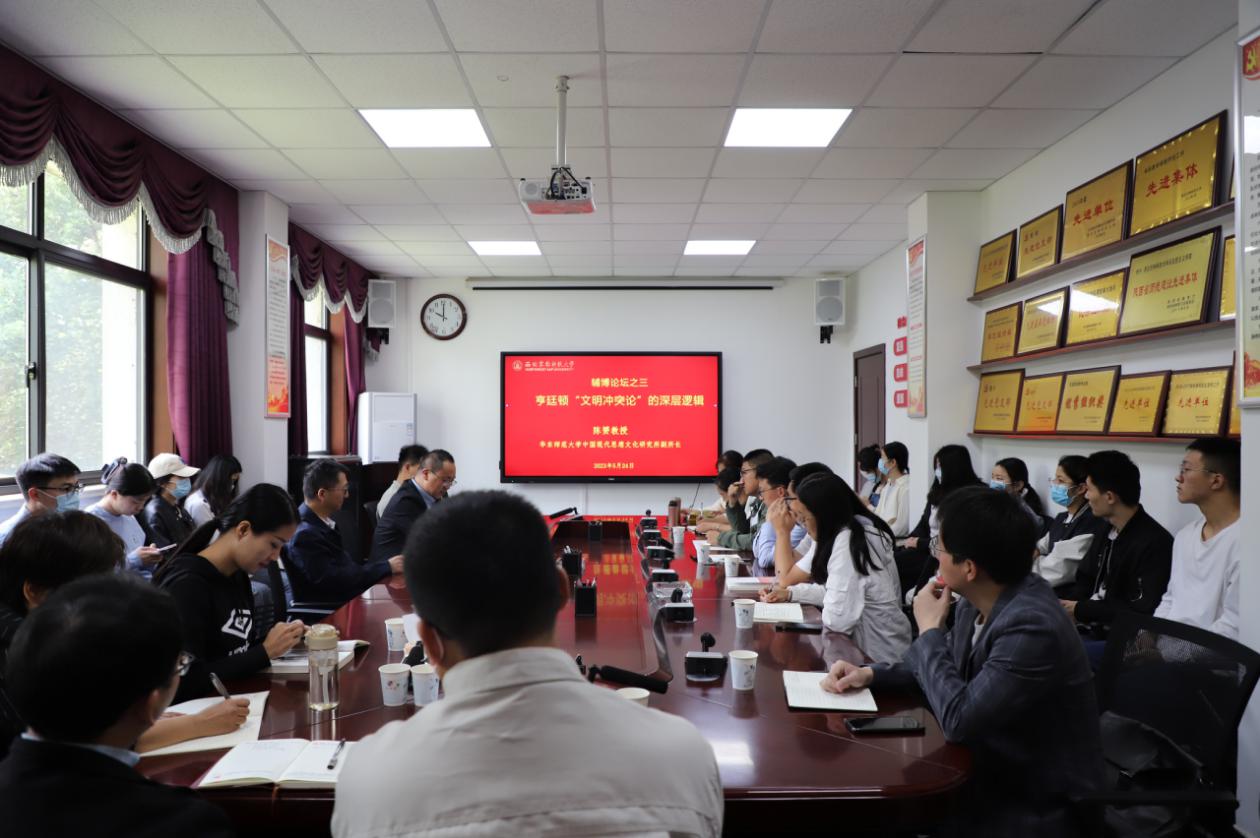 报告会上,陈赟教授作了题为《亨廷顿“文明冲突论”的深层逻辑》的专题报告。陈赟教授围绕“普世文明”话语的本质是意识形态、美国“普世文明”战略导致非西方世界归回本土文明认同以及西方统一战线瓦解和“文明冲突论”的“文明论”实质等方面作报告。他还在报告中提出,要在当今世界百年未有之大变局背景下,面对中西方文化消长,不断增强文化自信。