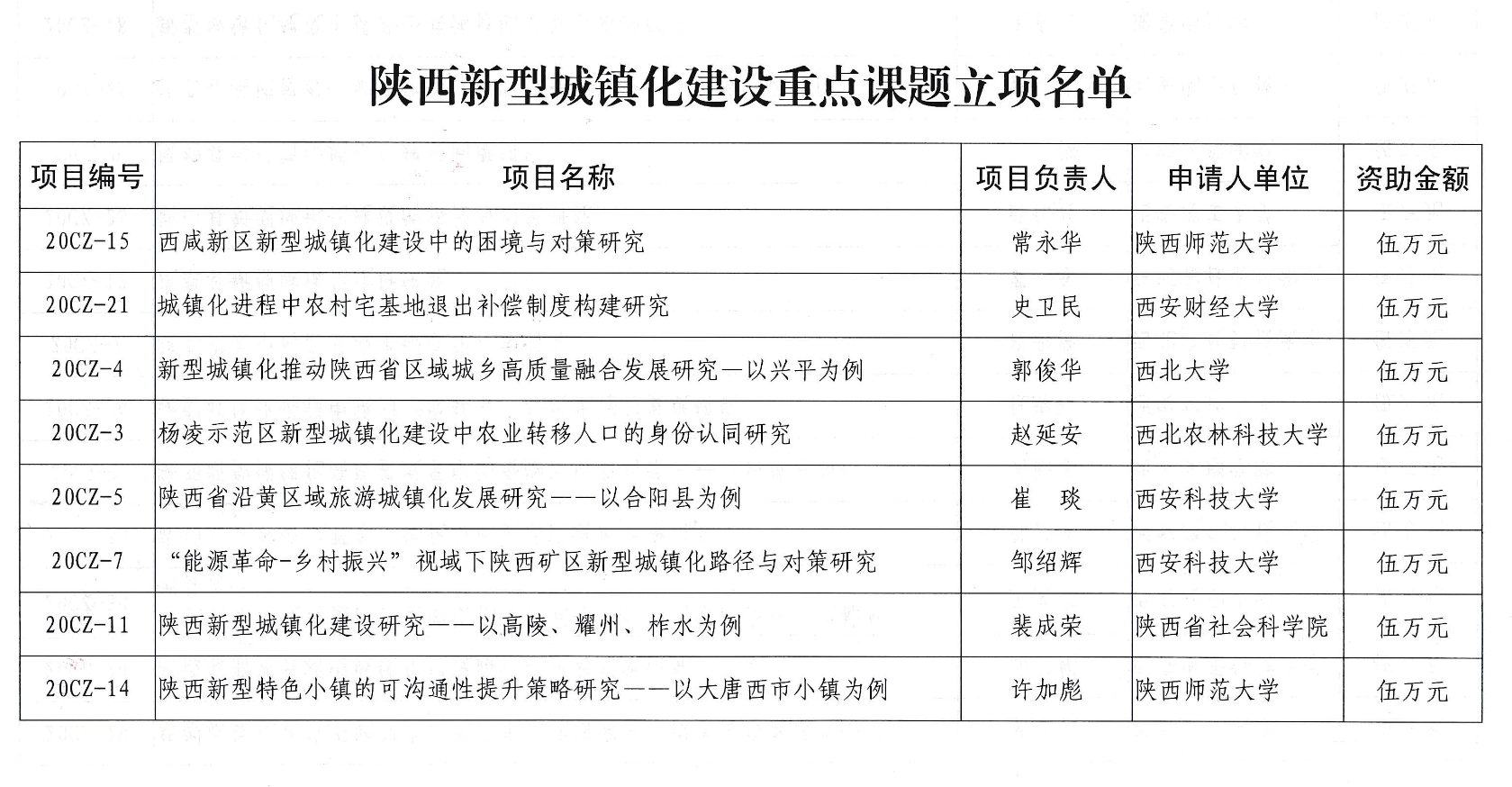 11月9日,陕西社会科学界联合会公布了“陕西省新型城镇化建设重点研究项目立项结果”,我院赵延安教授团队以“杨凌示范区新型城镇化建设中农业转移人口的身份认同研究”为题申报的重点课题获批立项,项目编号为20CZ-3。据悉,此次陕西社会科学界联合会共立20项,我校获批2项,每项资助经费5万元。