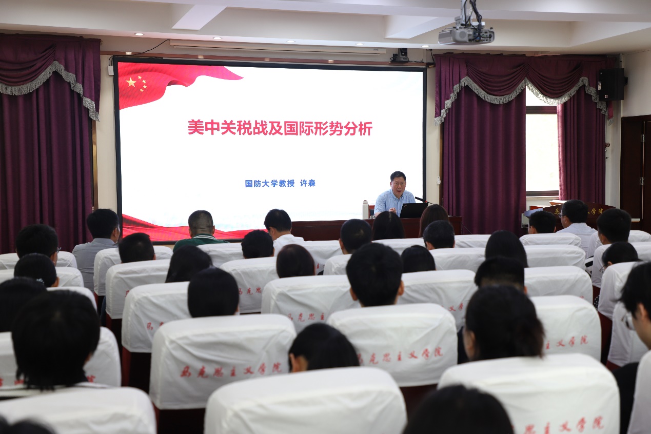 5月14日,我院特邀国防大学教授许森做客凤岗讲堂,围绕“美中关税战及国际形势分析”作专题报告。许森教授结合当前国际局势,深入剖析了美国发动全球关税战的动因、中美贸易失衡的深层逻辑及中国的战略应对策略。会议由学院党委书记闫德忠主持,我院全体师生参加。