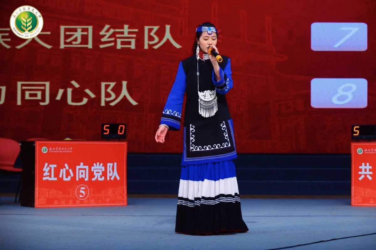 从初赛到决赛,“同心圆梦”队各位同学发挥各自优势,各显自身所长,充分展现了个体聪明智慧与团队合作力量。与700余名各族同学同台竞技,以优异成绩脱颖而出。风采展示环节,张万非同学在清唱彝语歌曲《春耕》,歌声清脆嘹亮,将在党的领导下彝族人民取得的美好生活娓娓道来,赢得现场观众和评委阵阵掌声。决赛必答题和抢答题环节,陈颜颜、张丹阳、赛雨薇三位同学,以超高的准确率和积极地参与度获得高分。此次竞赛不仅展现了马院学子过硬的综合素质和深厚的学科素养,也直观地体现了各位学子对中华民族、伟大祖国、中华文化、中国共产党和对中国特色社会主义的高度认同。