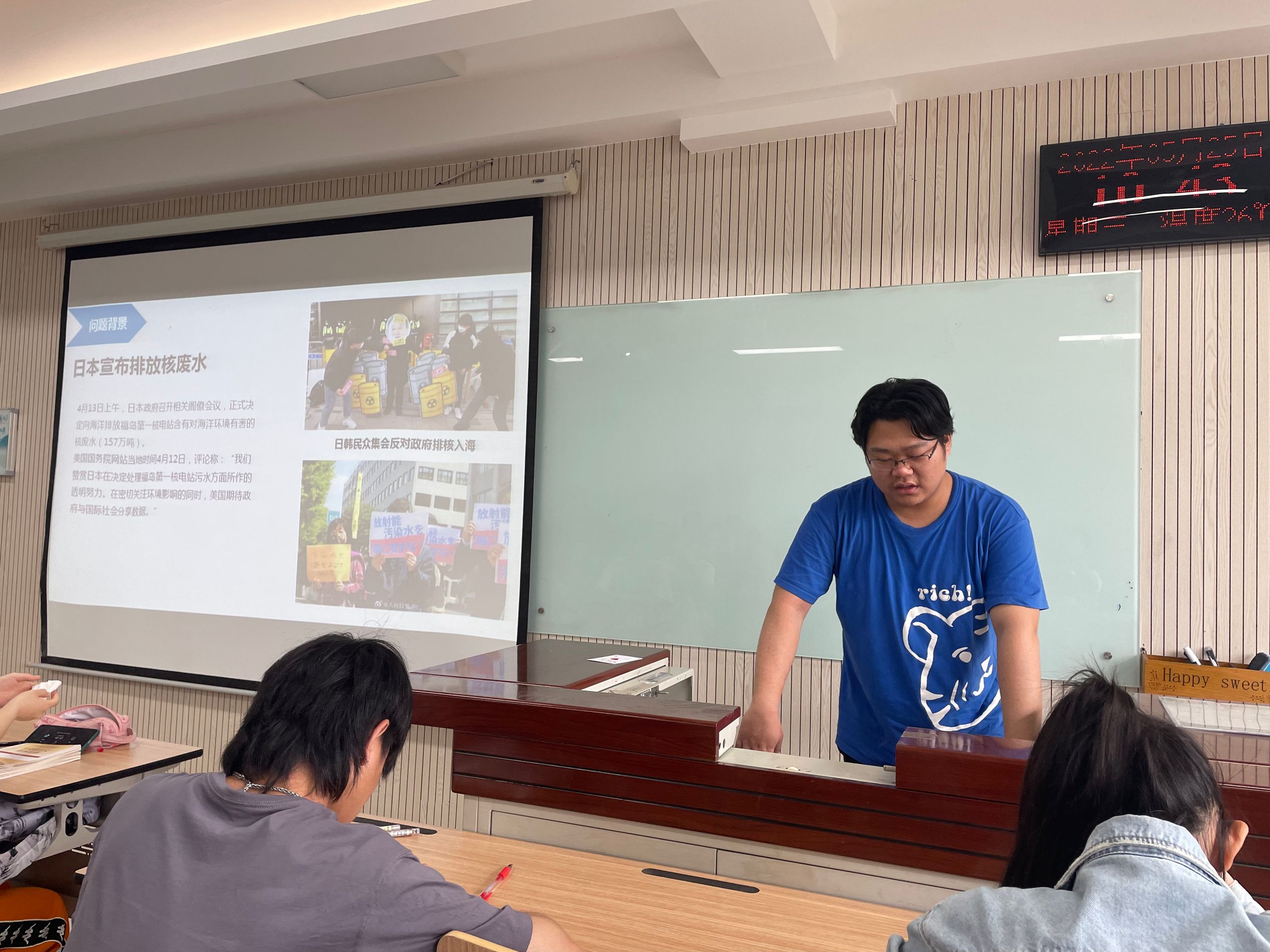 在活动进行过程中,同学们以马克思主义的科技观为理论依据,围绕日本“核废水排污入海”的决定展开热烈讨论,从多维角度探讨日本政府决定背后的深层次原因。许志航同学认为,该决定的最大因素是出于经济因素的考虑,是为了省钱,是日本经济萎靡与天价处理费用的一种妥协。司靖伟同学认为,日本内阁的软弱无能是导致“排污入海”的重要政治因素,该决定是日本国内政治斗争的结果。陶一飞同学指出,日本民族“拘小节而无大仁,见小利而忘大义,有小礼而无大仪”的文化秉性是重要原因。张鑫宇同学进行了总结,从马克思主义基本原理的角度指出应该辩证的对待科学技术的效应,正确的利用科学技术为人类服务。最后,殷旭辉主任对本次活动进行了点评。本次活动是提高思政课教学实效性的一次有益尝试,问题探究的方式能够更好的凸显学生的主体性,激发学生的内在学习动力,更好的培养学生独立思考和合作创新的意识。
