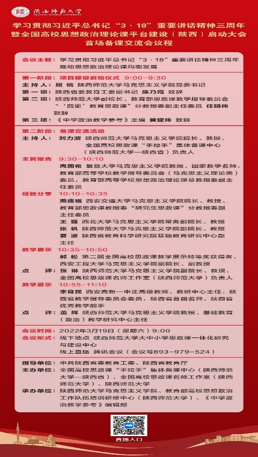 为纪念习近平总书记在学校思政课教师座谈会上的重要讲话发表三周年,深入学习习近平总书记关于高校思想政治教育工作重要论述,全面贯彻党的教育方针,持续推动思政课教学改革创新和内涵式发展,3月19日上午,马克思主义中国化系全体教师线上参加由中共陕西省委教育工委、陕西省教育厅指导,全国高校思政课“手拉手”集体备课中心(陕西师范大学——陕西省)、全国高校思政课名师工作室(陕西师范大学)、陕西师范大学主办的“学习贯彻习近平总书记‘3·18’重要讲话精神三周年暨全国高校思想政治理论课平台建设(陕西)启动大会首场备课交流会”。