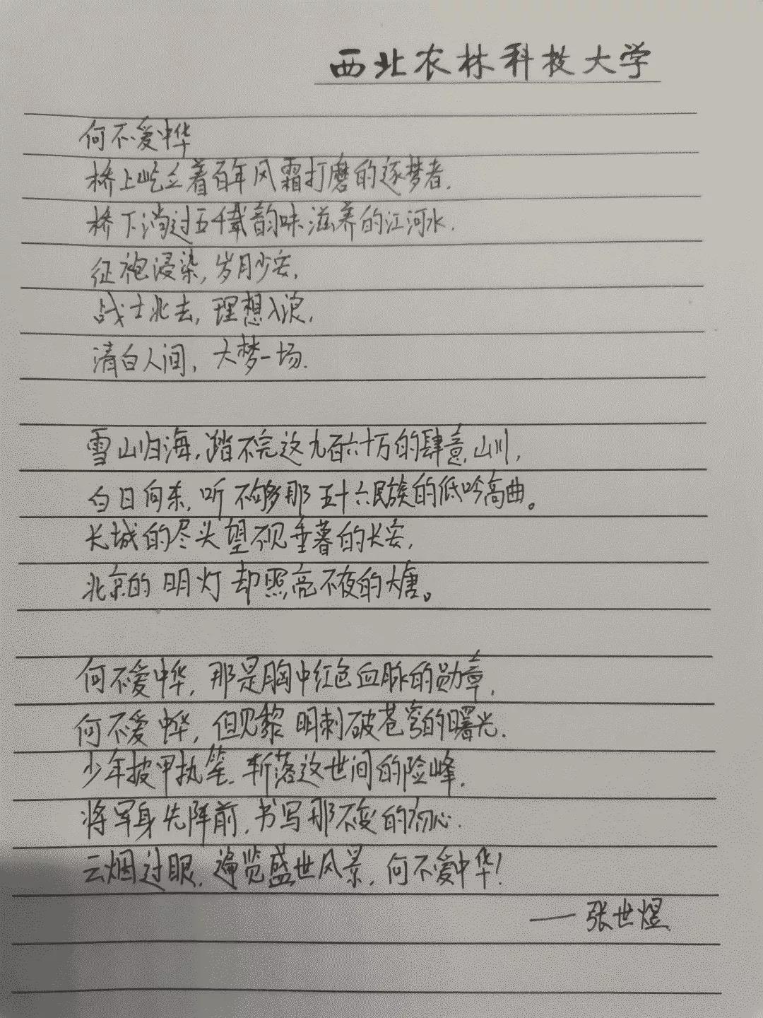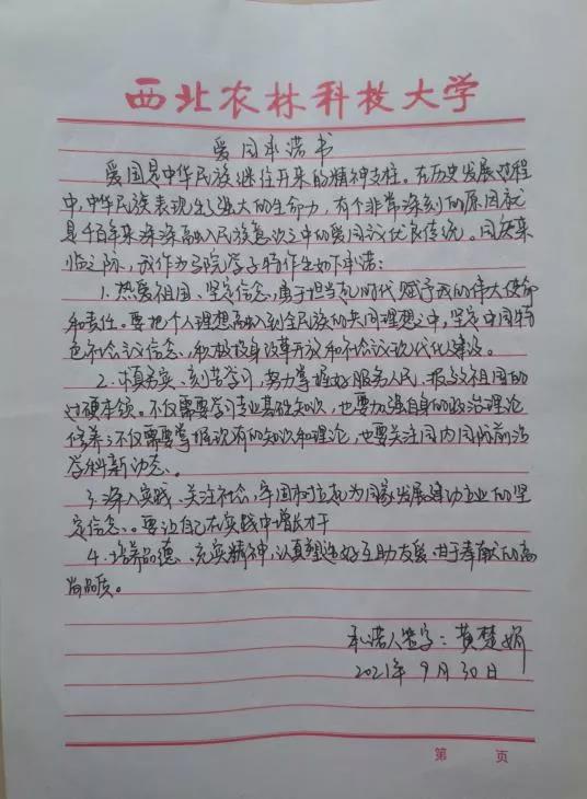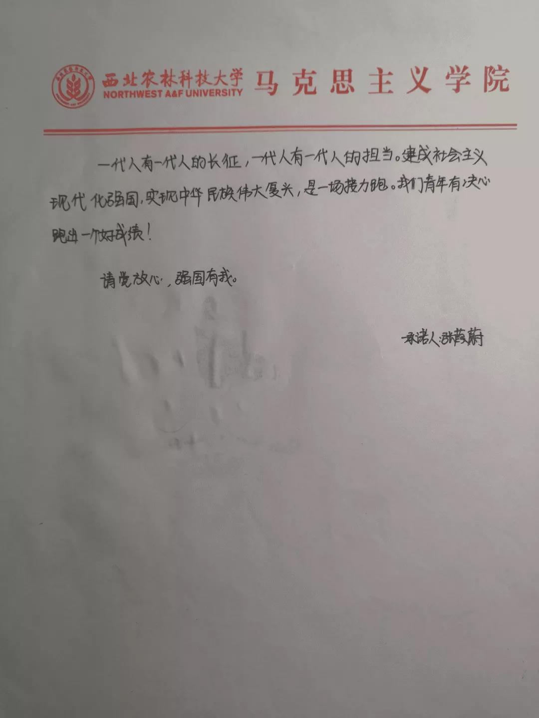 为了更好庆祝祖国华诞,我院多名学子发挥抒发与文笔特长,书写强国誓言、抒发爱国情怀。2020级研究生团支部书记周映柯同学书写软笔作品《请党放心,强国有我》,一撇一捺写尽马院青年爱国情怀;马院研究生会心理部部长张葭蔚、文体部部长黄楚娟两位同学,在其爱国承诺书中纷纷表表达“我们青年一代有决心在新征程中跑出一个好成绩”、“要让自己在实践中增长才干”的青春亮丽底色;2020级研究生安怡萱、2021级研究生黄润钰以手抄经典名言的形式表达民族的自信心与青春的战斗力,积极抒发爱国情;2021级研究生何晓东手抄于右任爱国诗作《望大陆》并手写《给于右任先生的一封信》,回顾于右任先生为我国革命及教育事业作出的突出贡献,用谆谆誓言表达爱校爱党爱国之情;2021级研究生张世煜自创诗歌《何不爱中华》,“何不爱中华,那是胸中红色血脉的勋章”……深情表达对革命先烈的怀念与对祖国的热爱。